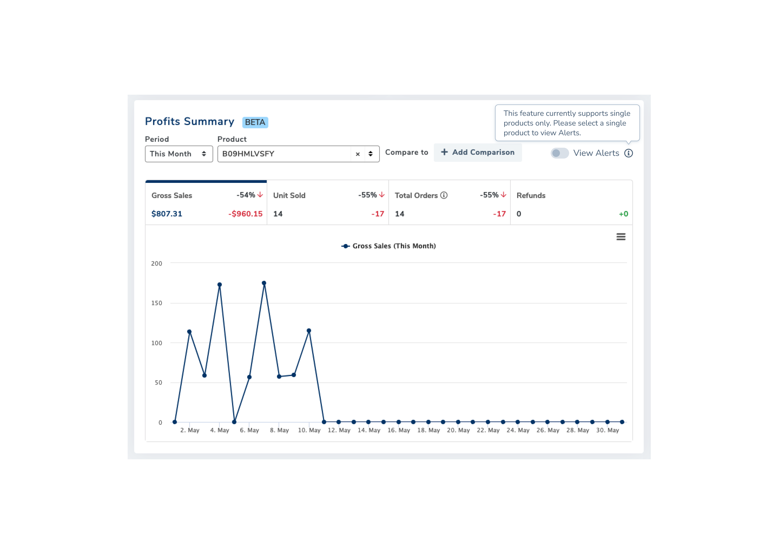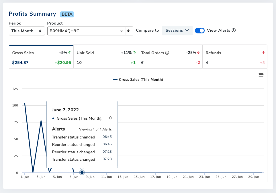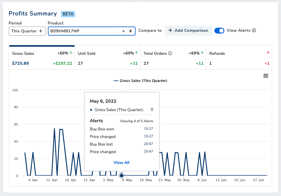 “As an active Amazon seller, I would like to see the events detected from the Alerts tool in comparison to my product(s) KPIs so that I can gather information and insight on why certain trends or changes are the way they are.”