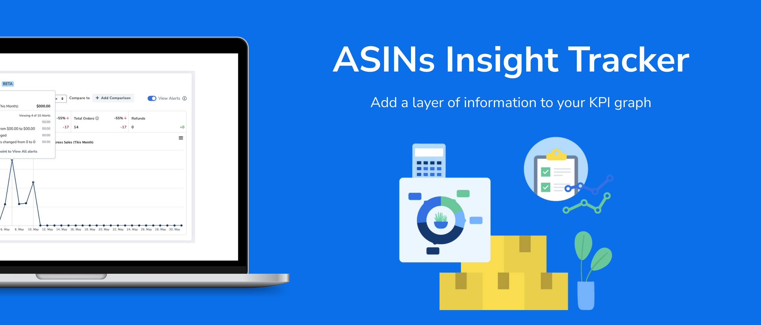ASINs Insight Tracker is a feature to help a seller when reviewing the performance of a product inside Helium 10. Over time, the seller won't be able to easily see the changes that have occurred to that product in relation to the KPI measured. Helium 10 offers an Alerts tool that detects events for monitored products. We want to lay the Alerts events over product KPI graphs so that sellers' can get insights into why certain products are performing how they are.