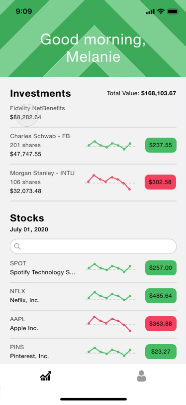 The user can see the total value of their investments with the 3 connected accounts pinned to the top. The main dashboard also gives you an update on other stock options and gives users a way to search for other stock. The user can click into any of their connected accounts like Fidelity NetBenefits to show a more detailed view of their 401(k).